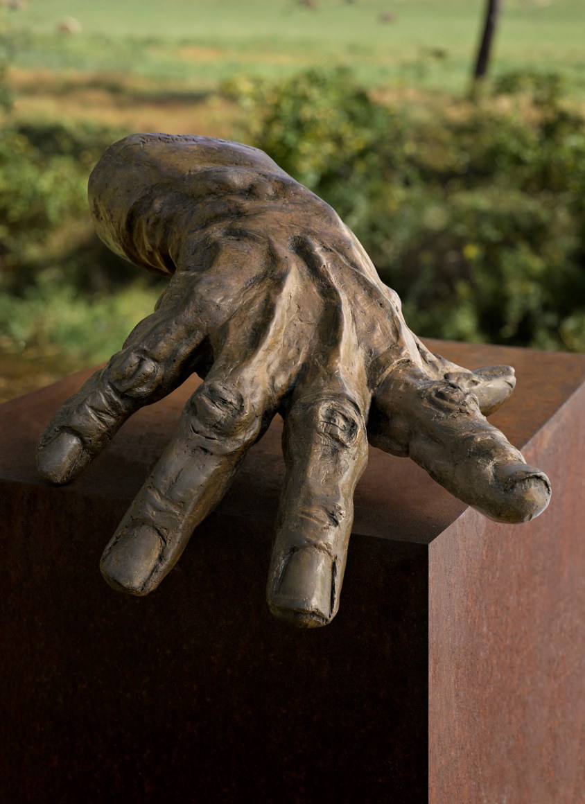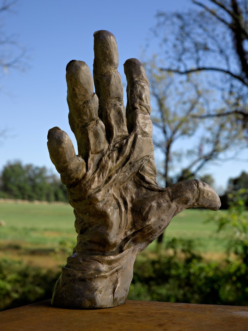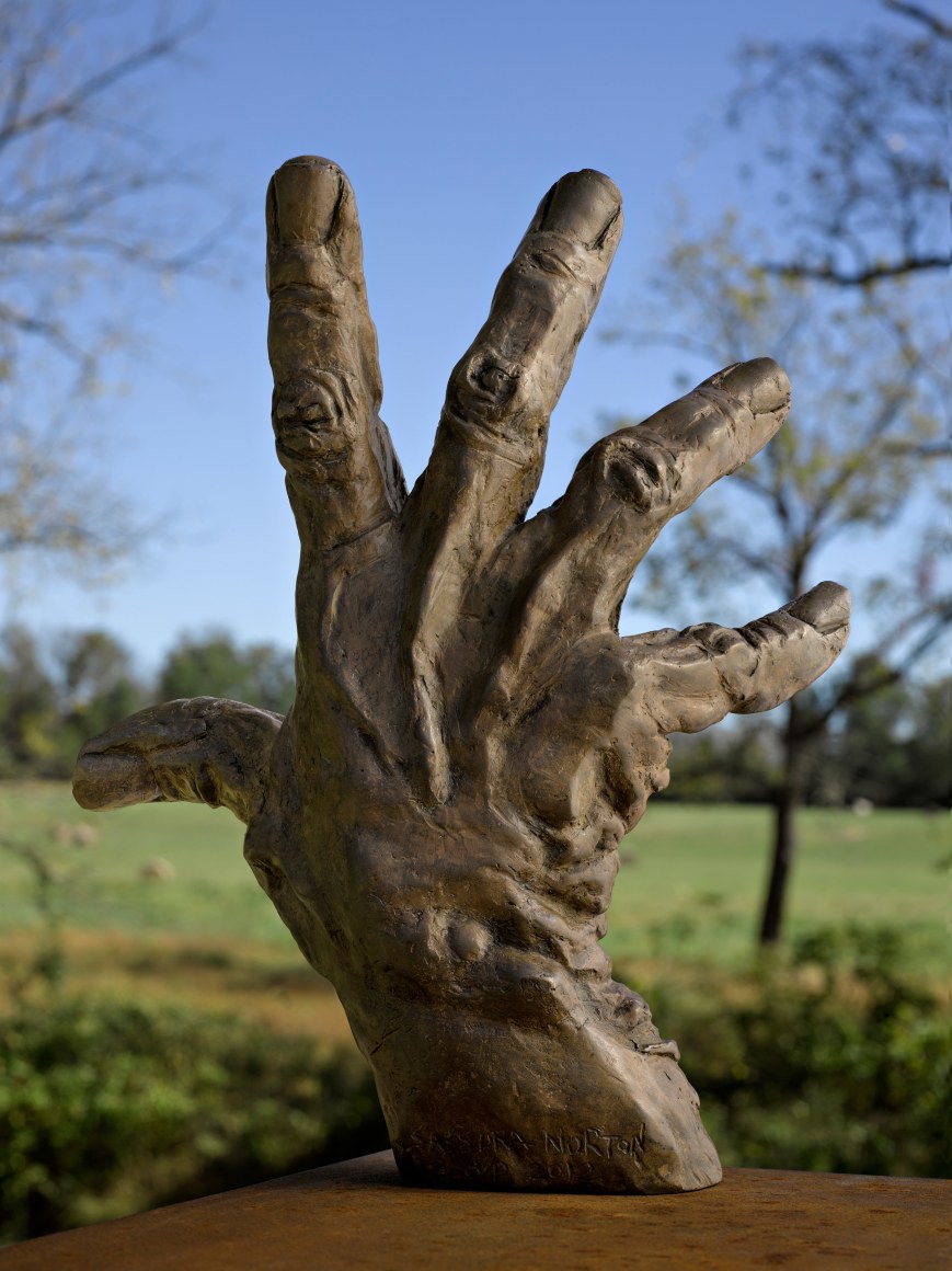 A single hand, spreading its fingers as wide as possible, points to the effort to reach beyond limitations. Placed horizontally, the gesture brings to mind a pianist’s hand grasping for a distant key. Placed vertically, the hand transforms to a tree extending its limbs into the light. In both versions, what is absent plays an important role as what is present.