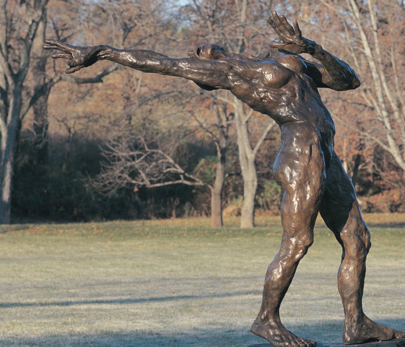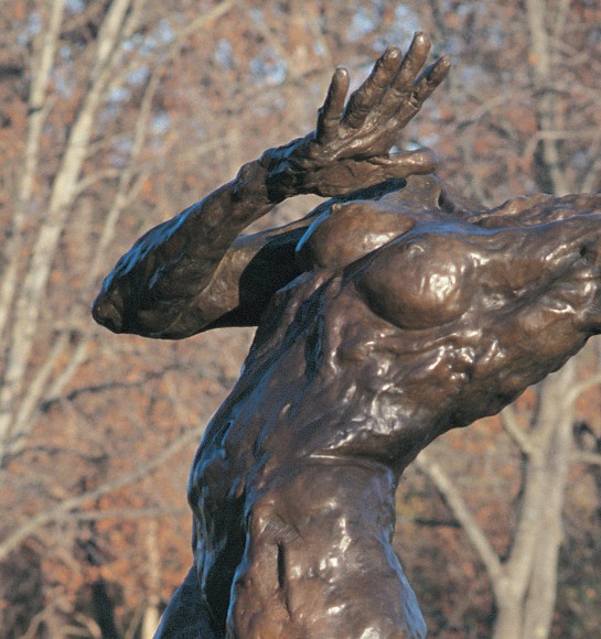 The movement of the figure points in different directions: walking forward, yet stretching and arching back towards a passing light. The movement suggests a desperation and yearning to hold on to the inevitable: light, like time, is transitory. But unlike time that moves on in familiar patterns, light movement may be unpredictable, making it more precious and bringing on a greater anxiety.